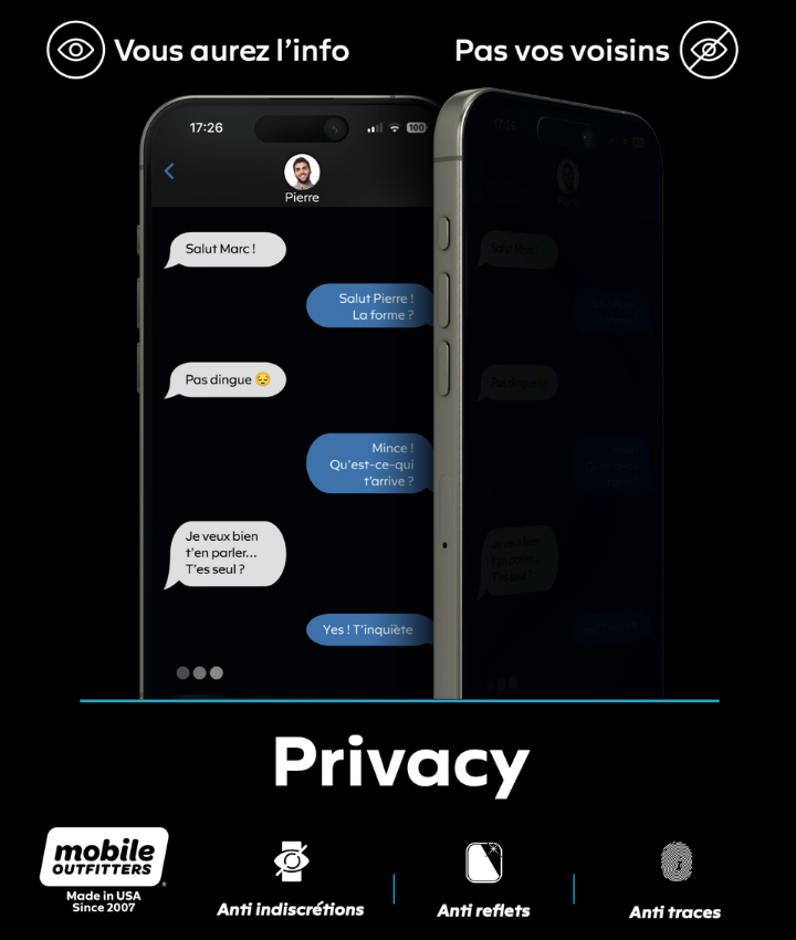 Le Privacy est pensé pour protéger l’écran des regards latéraux. C’est une option particulièrement utile si vous consultez souvent des mails, messages ou documents dans les transports, en open space ou lors de déplacements. Chez Macavenue, nous le proposons justement pour les clients qui veulent un peu plus de confidentialité sans renoncer à la protection.
